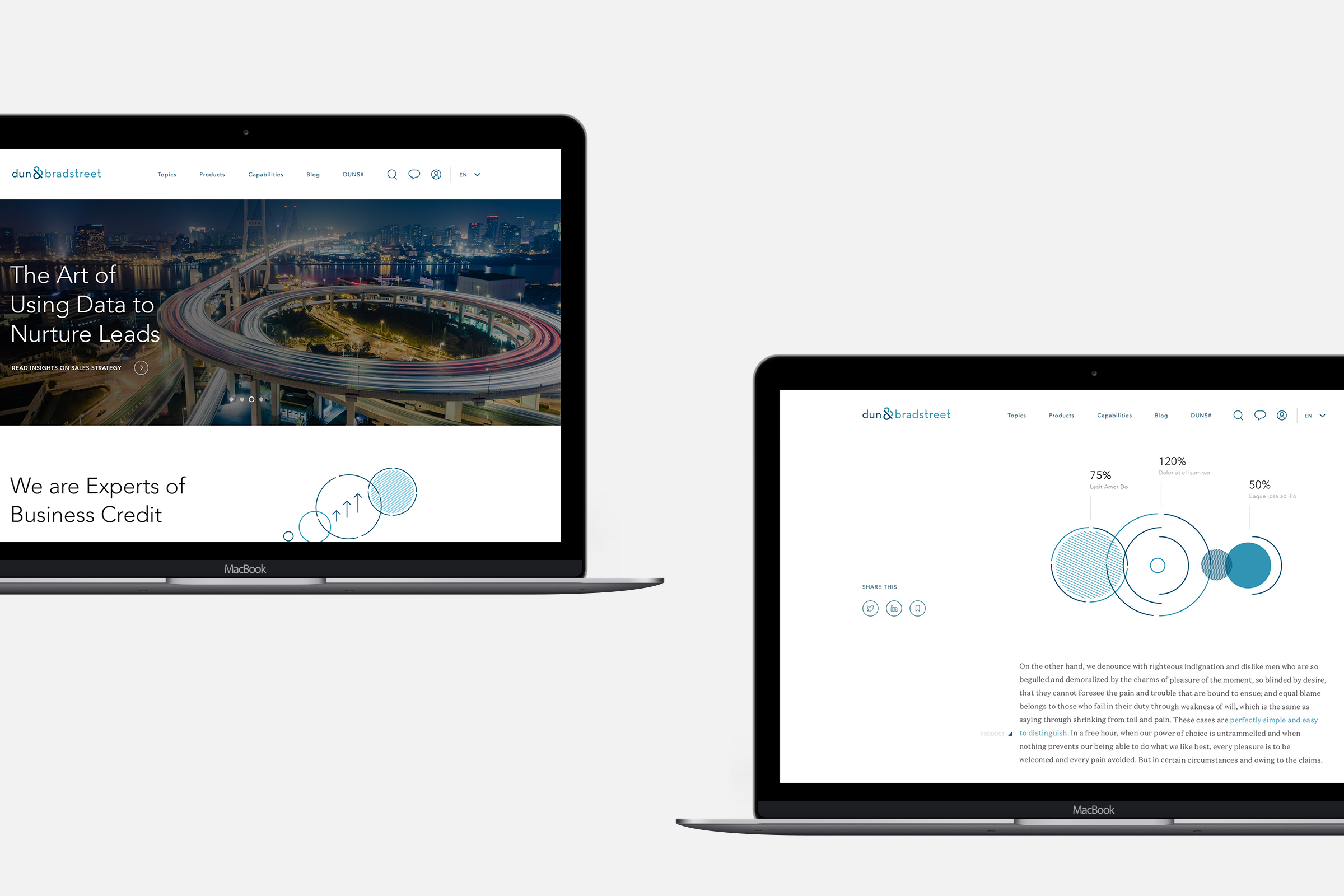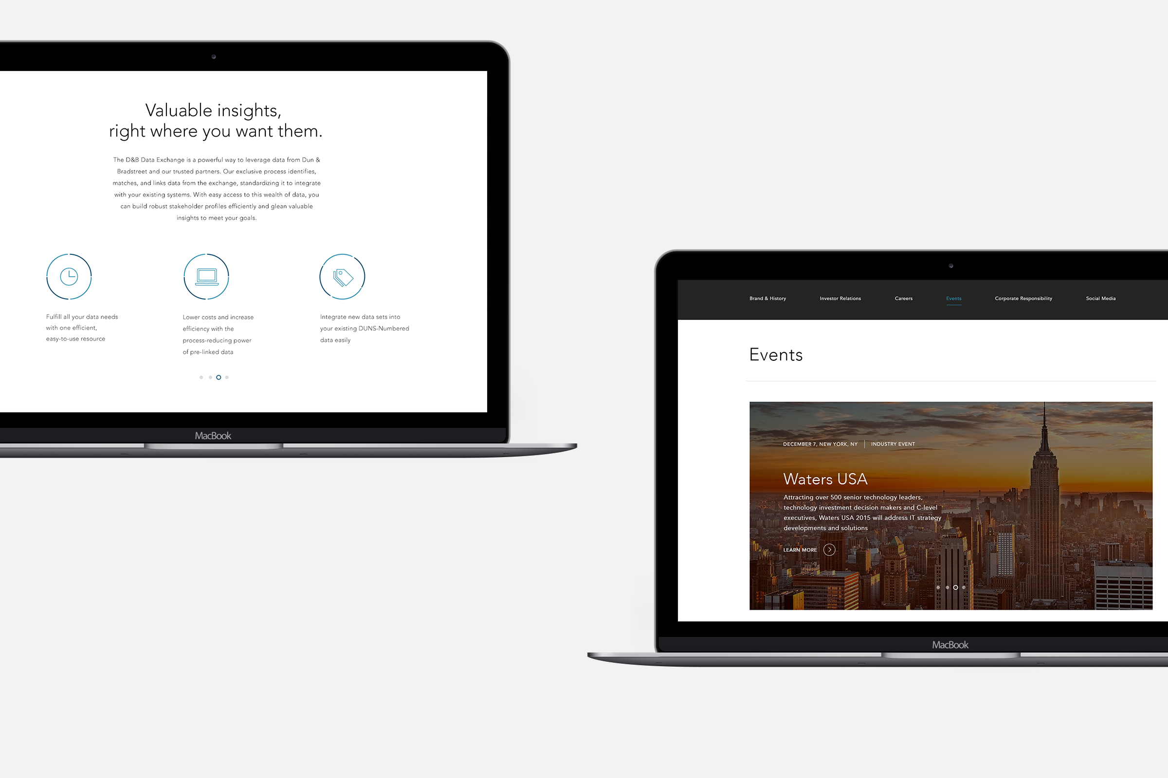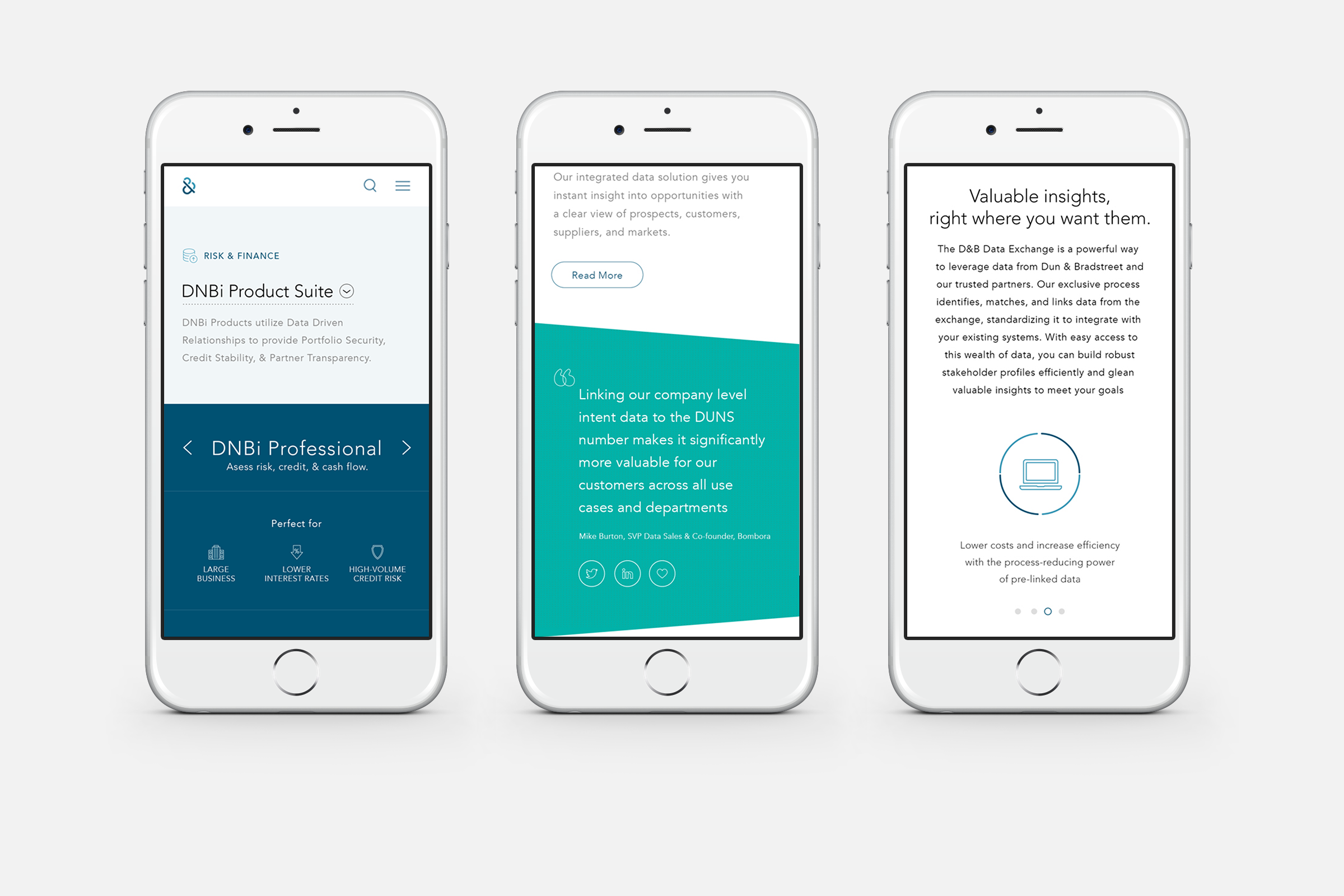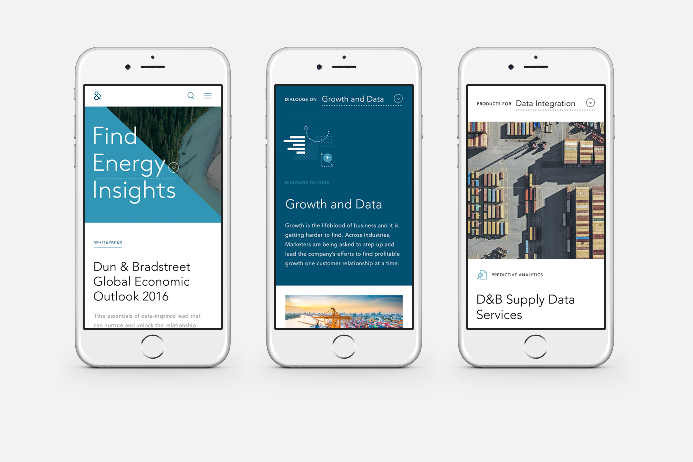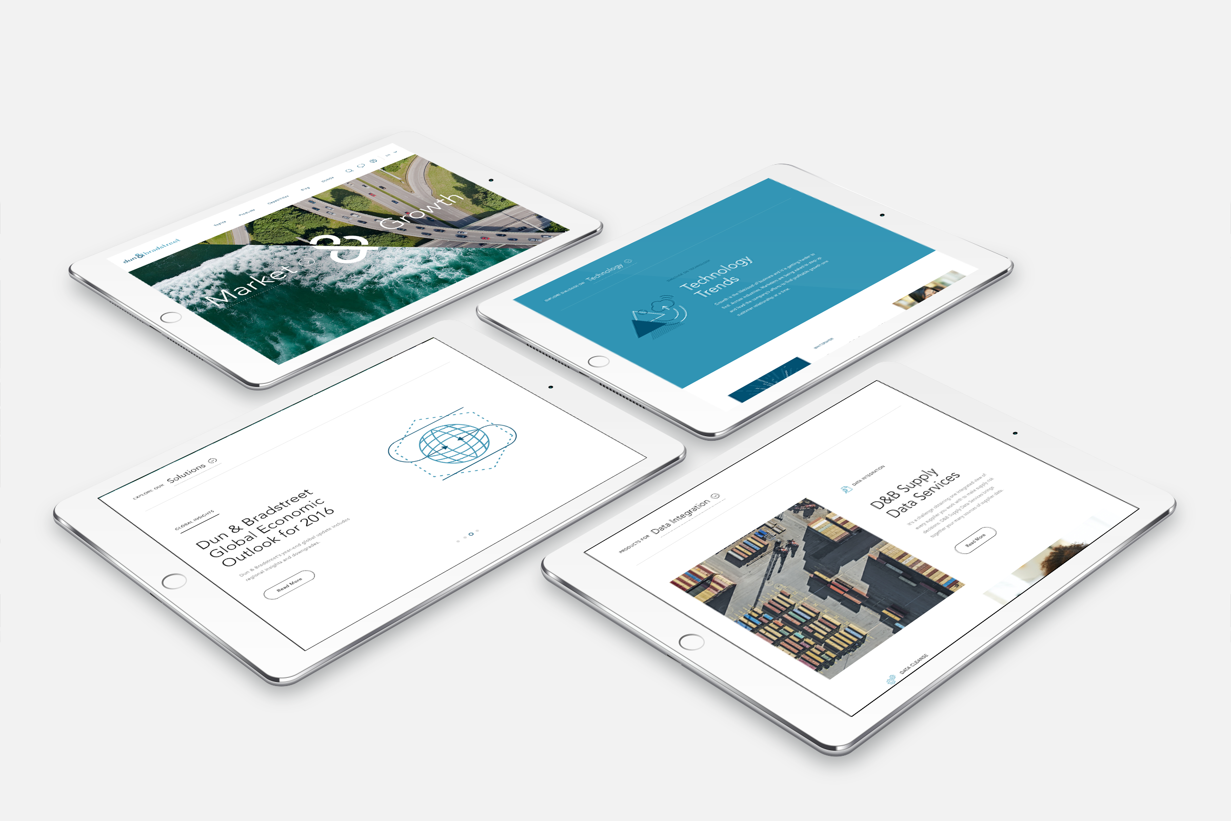 Dun & Bradstreet clients want the website to feel approachable and conversational, but still exist within the data.They need a to find opportunities to push the brand elements into new directions and refine a few as well. Whitespace is almost as important to our new brand as the mark itself.